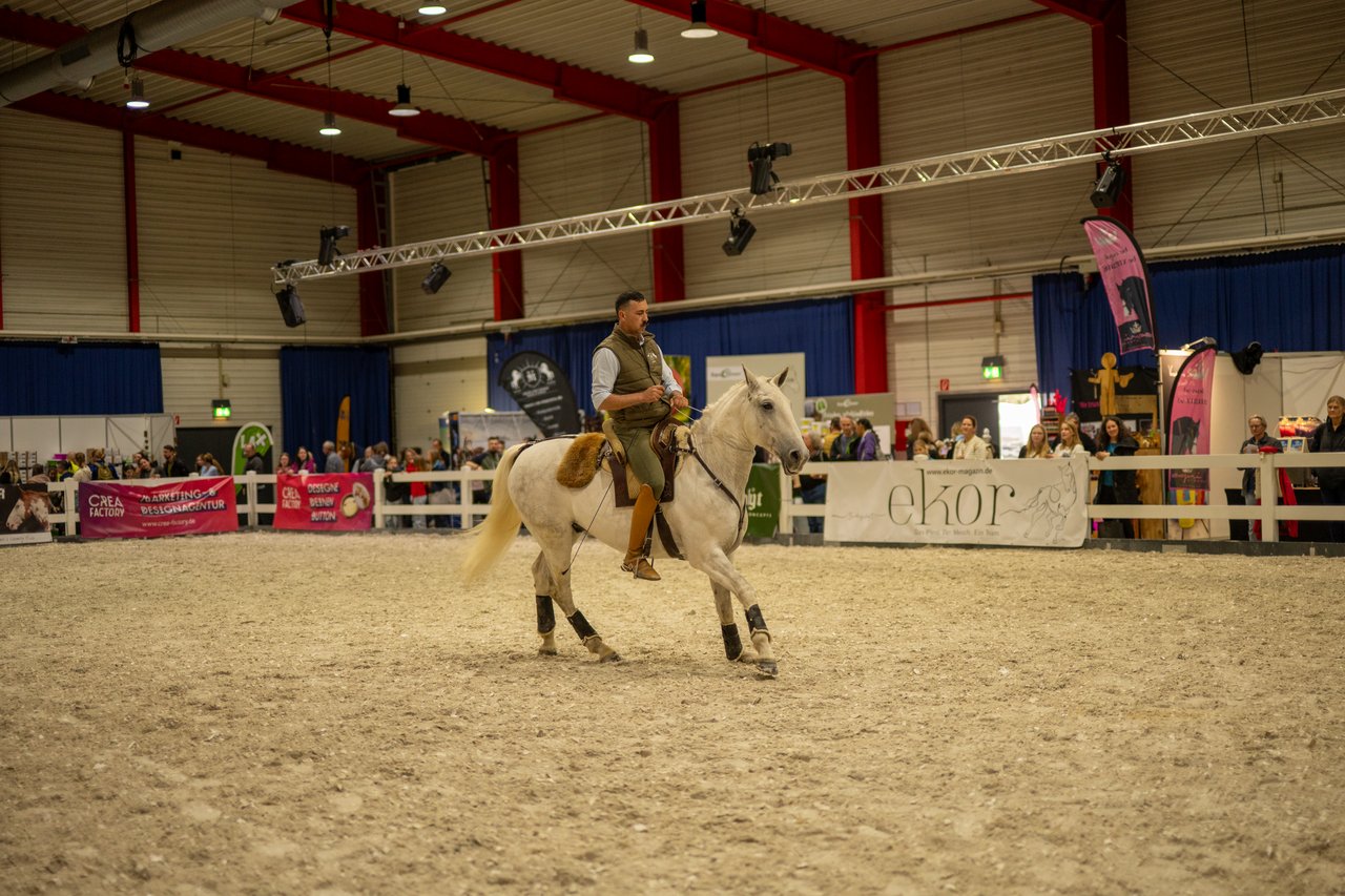 Schon am ersten Veranstaltungstag herrschte reger Betrieb in den Hallen und an den Reitringen, wo zahlreiche Besucher das Showprogramm und die Fachvorträge verfolgten. Am Freitagabend standen direkt zwei große Highlights auf dem Programm: In Halle 1 fand der Working Equitation Cup unter der Leitung von Mitja Hinzpeter statt, während parallel in Halle 6 ein stimmungsvoller Showabend mit der Pro Horse Union begeisterte.
